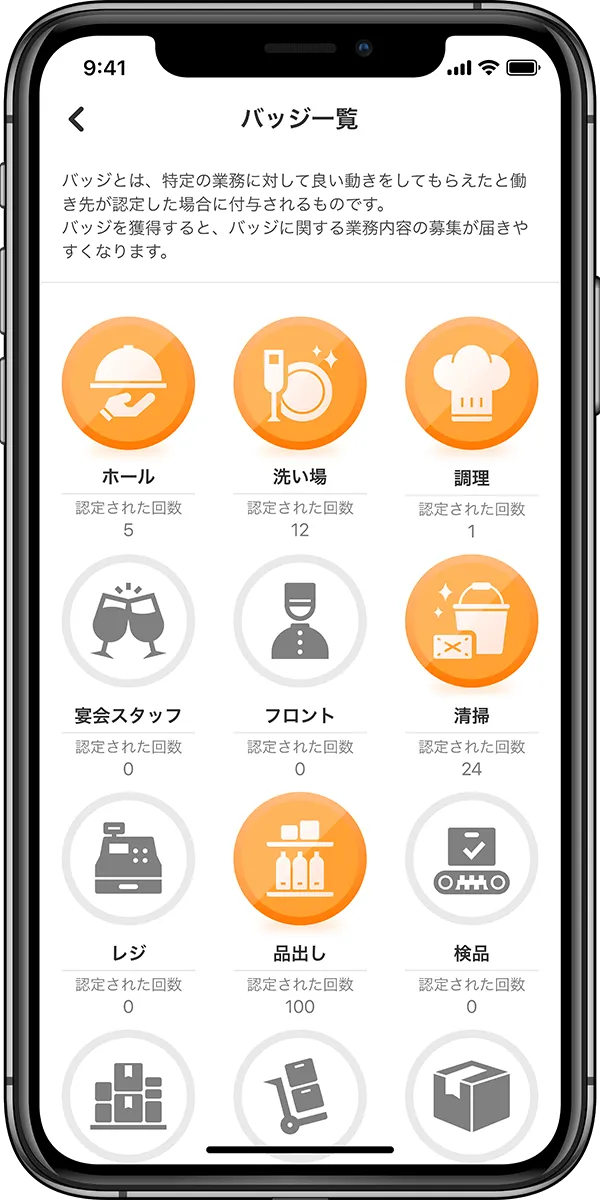 届きやすくなる!勤務先から認められた業務が「バッジ」として蓄積されていきます。バッジを保有することで、お仕事のリクエストが増えたり、時給の高い求人が届きやすくなります。
