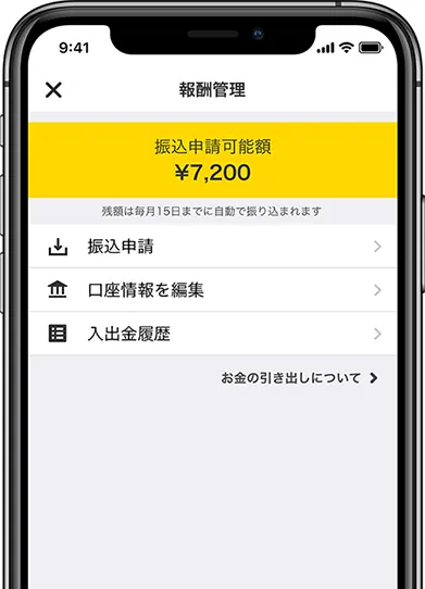 仕事が終わり、QRコードを読み込んだらすぐに報酬が確定。いつでもご指定口座へお振り込みができます。